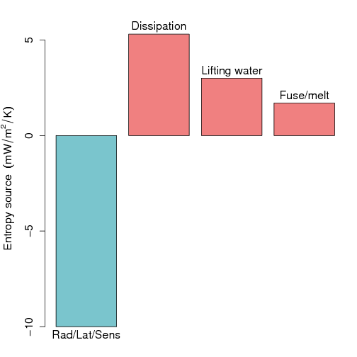 It is shown, both from theory and from simulations, that the dry-entropy budget may be described as a balance between six terms. The first three terms are generated by the addition and removal of sensible heat by surface heating, condensation in the free troposphere, and radiative cooling of the atmosphere. Together these three terms make a net entropy sink that is balanced by three entropy sources. In order of decreasing magnitude, these entropy sources are generated by dissipation (as generated by the bouyancy of plumes), the lifting of water (the "elevator"), and the freeze-melt cycle of condensates near the melting line (an effective "conductor" of heat from the relatively warm melting line to the relatively cold troposphere above it).