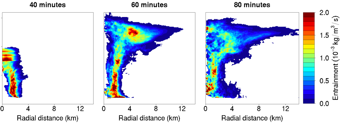 The new direct-measurement technique reveals the spatial structure of entrainment, shown here azimuthally averaged, for three intervals during the life cycle of a cumulonimbus.