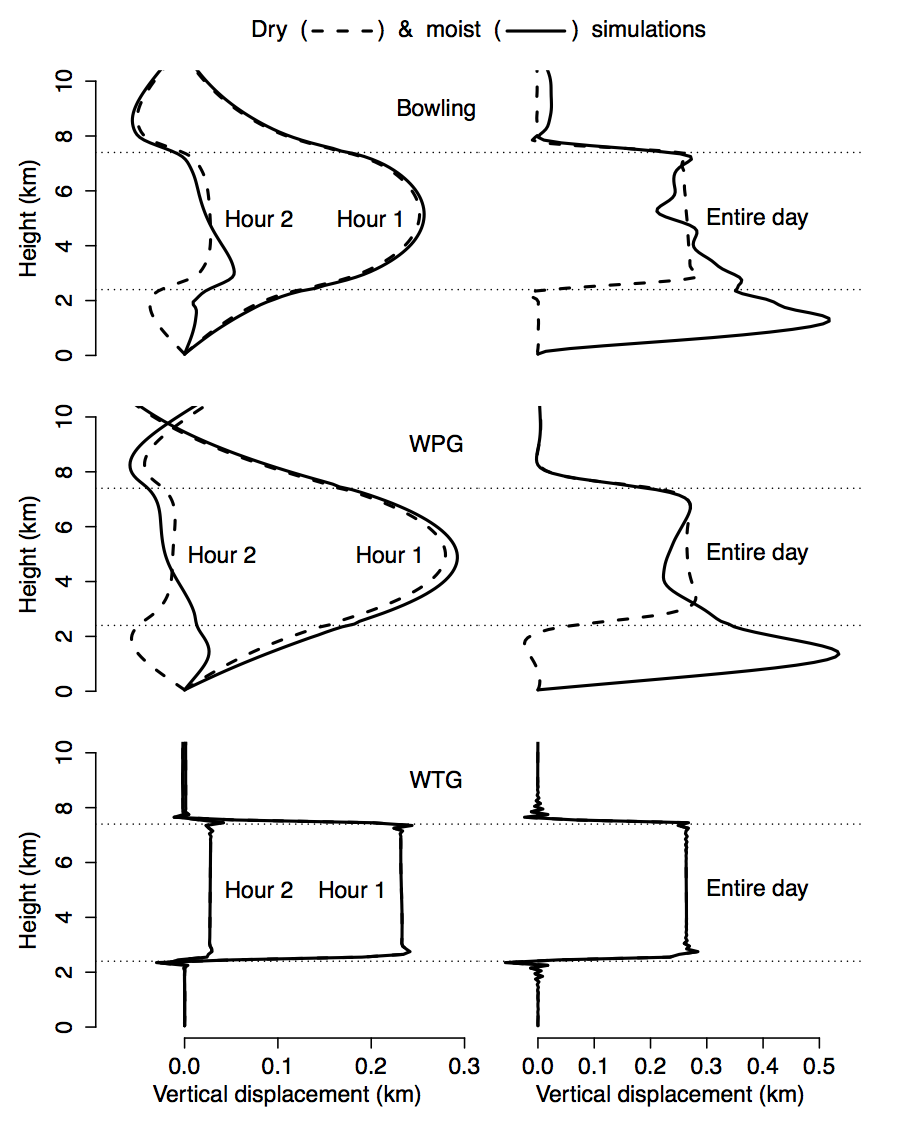 Net vertical displacements (integrals over time of vertical velocity) for a benchmark bowling-alley simulation (top row), WPG (middle row), and WTG (bottom row). The left column shows the net displacements generated during the first and second hours to give a sense of the temporal evolution of the column. The right column gives the net displacement during the entire day. Dashed curves are from dry simulations and solid curves are from simulations containing lower-tropospheric humidity.