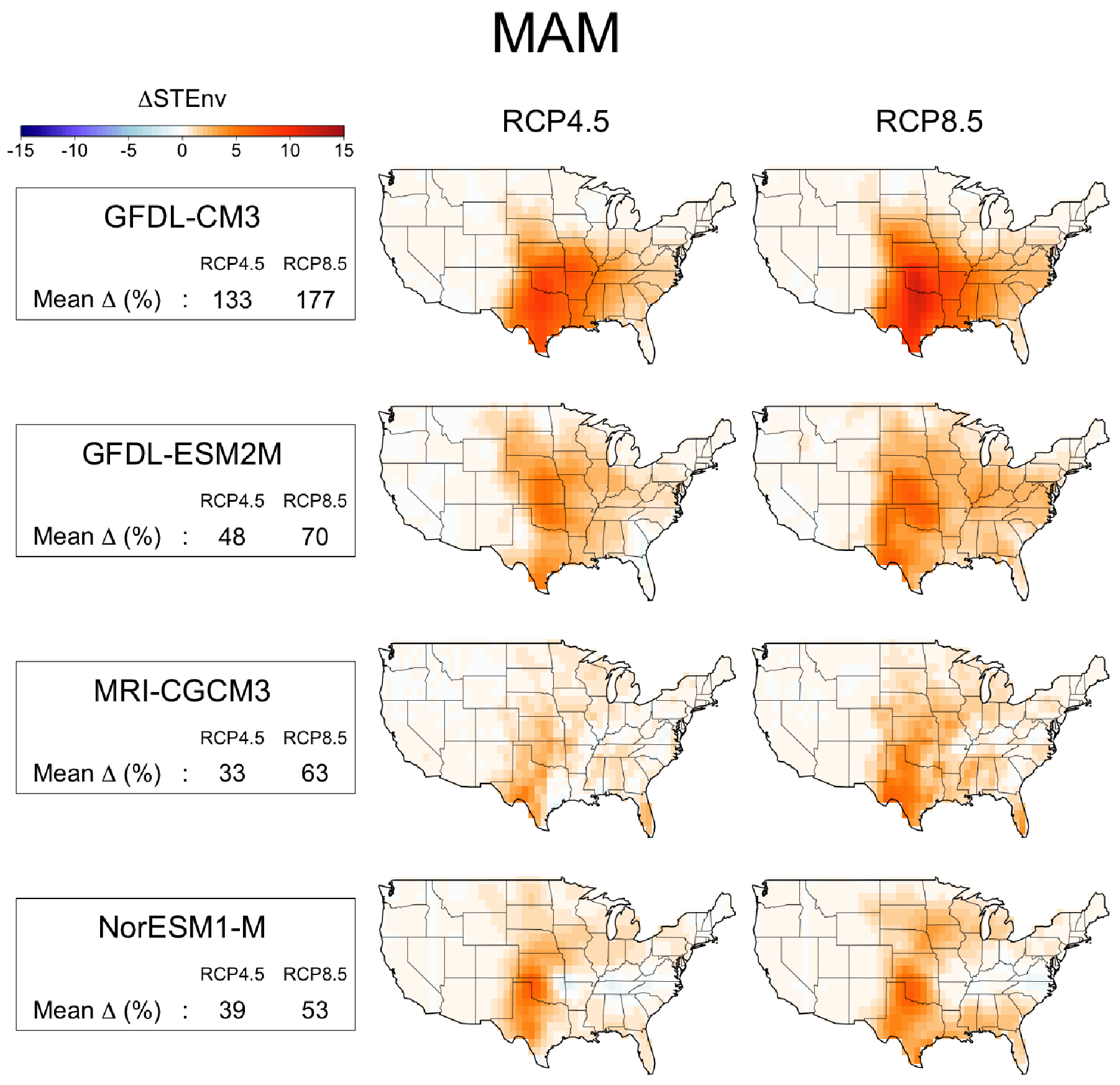 From the top-performing models, the distribution of increases in spring severe-thunderstorm environments in two emissions scenarios (RCP8.5 is business-as-usual).
