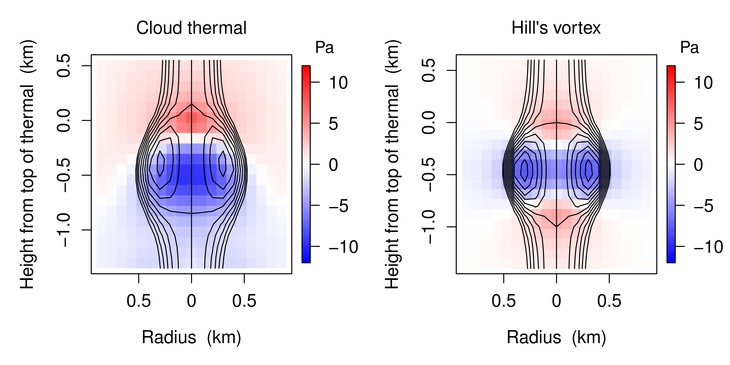 Hill's vortex (shown on the right) is a classic steady-state solution to inviscid fluid dynamics. It is slippery thanks to the fore-aft symmetry in its pressure perturbations. Real cloud thermals do not have this symmetry. In fact, the symmetry is necessarily broken by their positive buoyancy, leading to asymmetric pressure perturbations and a net drag force.