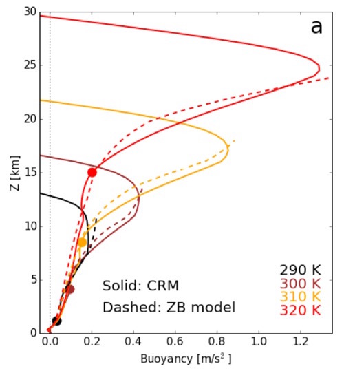 (solid) Profiles of undiluted parcel buoyancy in a cloud-resolving model for surface temperatures of 290, 300, 310, and 320 K. (dashed) Corresponding profiles of undiluted parcel buoyancy from the zero-buoyancy plume model. Solid circles mark where the theory predicts the transition to large upper-tropospheric buoyancies. Note that CAPE is proportional to the area enclosed by these curves.