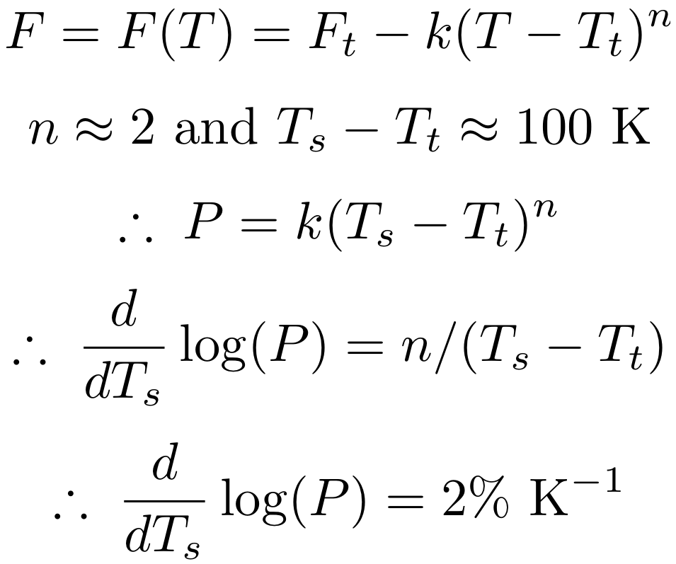 Why does the equilibrated global precipitation rate increase at roughly 2% per K in all global climate models? The reason stems from the fact that water vapor is the dominant greenhouse gas (as well as the dominant shortwave absorber) and that its density is a fixed function of temperature. As a result, the atmospheric profile of net upwelling radiative flux F is very well approximated by a fixed function of temperature, F = Ft - k (T - Tt)n, where k and n are positive constants and Ft is the net flux at the tropopause. Therefore, the net radiative cooling of the troposphere, Ft - Fs, is equal to k (Ts - Tt)n, where s denotes the surface. Since the radiative cooling of the troposphere is largely balanced by the release of latent heat, the precipitation rate P, measured in W m-2, is also equal to k (Ts - Tt)n. Therefore, since Tt is invariant (think FAT, or see our upcoming paper on FiTT), the fractional change in precipitation per change in surface temperature is n/(Ts - Tt). For Earth, n = 2 and the depth of the troposphere is 100 K, so precipitation increases at 2% / K.