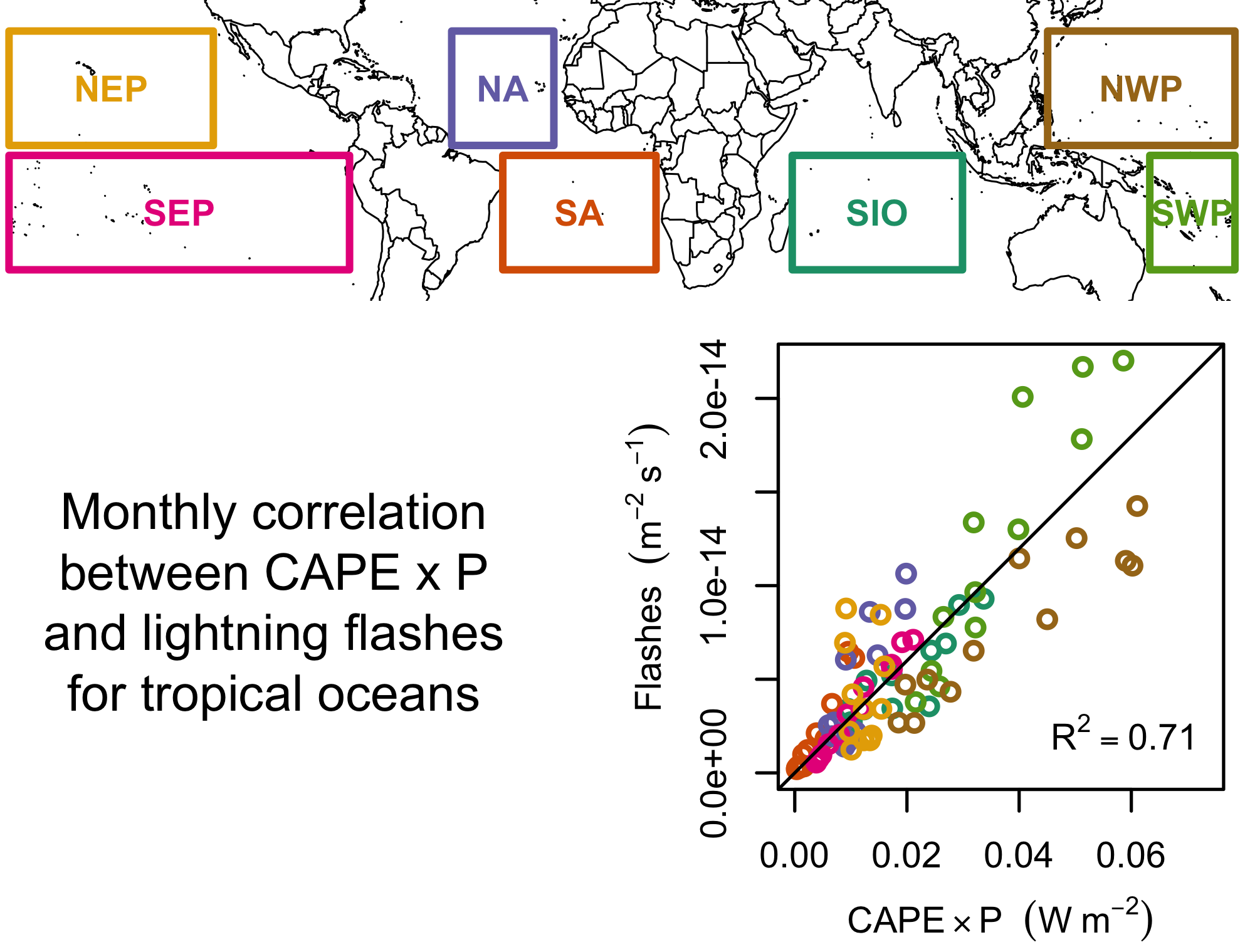 Monthly climatology of observed flash rate per area versus the monthly climatology of reanalysis CAPExP for each of seven ocean basins (the seven colors in the scatterplot). The scatterplot has 7 x 12 = 84 points corresponding to a monthly climatology for each of the seven ocean basins.