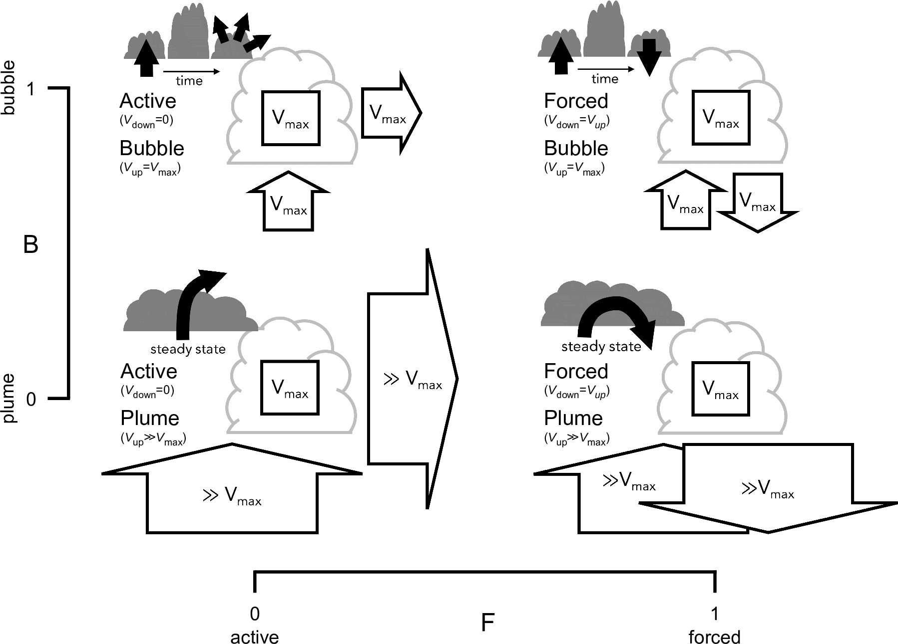 The four extreme cases of a shallow cumulus cloud: (top left) an active bubble with F ≡ Vdown/Vup = 0 and B ≡ Vmax/Vup = 1, (top right) a forced bubble with F = 1 and B = 1, (bottom left) an active plume with F = 0 and B = 0, and (bottom right) a forced plume with F = 1 and B = 0.