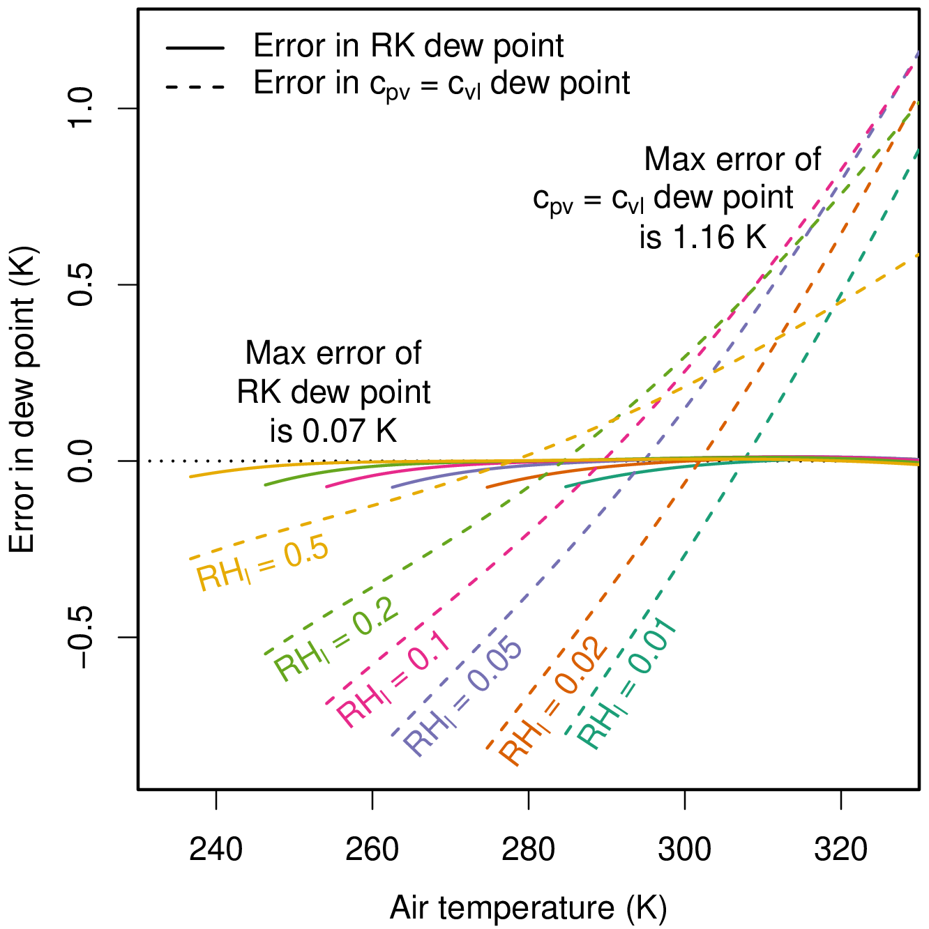The error in the old (cpv=cvl) and new (RK) analytic expressions for the dew point relative to the empirical fit of Murphy and Koop (2005).